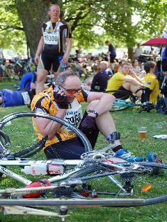 Km 80 Depot Gränna: 26,9 km/h Ø, 1:17 h Fahrtzeit (Anmerkung zur Durchschnittsgeschwinigkeit: Sie bezieht sich auf die gesamt gefahrenen Kilometer.) Wieder ein Tass Kaff und ein Becher Blaubeersuppe. Etwas gewöhnungsbedürftig, aber lecker. Es ist schon fast hell. Ich fahre weiter. Kurz vor Jönköping gibt es eine sehr lange Abfahrt. Ich lasse mich nur rollen und fahre trotzdem fast 55 km/h. Zur rechten Seite liegt der Vaetternsee, man schaut von oben hinab. Traumhaft schön. Km 109 Depot Jönköping oder die größte Würstchenbude der Welt: 27,7 km/h Ø, 56 min Fahrtzeit 4:42 Uhr: Ich traue meinen Augen nicht. Es ist eine riesige Halle, in der meterweise Tresen aufgebaut worden sind, an denen Essen und Getränke ausgeschenkt werden. Hier gibt es außer den üblichen Getränken Milch, Hafergrütze, Bananen, Kartoffelpüree und Würstchen. Esse ein bißchen Pü mit Wurst und schicke Silvia eine SMS. Es ist hell. Ohne Licht fahre ich weiter. Kurz nach Jönköping, ca. km 120, ist eine Steigung. Mehere steigen ab und schieben. Km 140 Depot Fagerhult: 27,8 km/h Ø , 1:09 h Fahrzeit Ach ja, wir haben WM. Mehere Deutsche haben sich Fahnen ins Gesicht gemalt. Halte mich nicht so lange auf. Bißchen was trinken und weiter. Unterwegs stehen mittlerweile ein paar Zuschauer. Teilweise stehen sie mitten in der Prärie und feuern einen an. Genauso sieht man am Strassenrand immer wieder erschöpfte Fahrer liegen, die sich ein Mütze Schlaf gönnen oder den Blick über den schönen See geniessen. Überhole die ersten dreistelligen Nummern. Von km 160-168 wird wieder richtig Gas gegeben. Bei km 175 geht's an der ersten "200" Nummer vorbei. KM 178 Depot Hjo: 28,6 km/h Ø , 1:12h Fahrtzeit 7:40 Uhr: Hier muß man sich wirklich merken, wo man sein Rad abstellt. Hunderte, gar tausende von Rädern stehen an Bäumen, Zäunen, Mauern oder was sonst noch gut zum Anlehnen ist. An den Dixie's ist die Hölle los. Lasagne, Salate usw. gibt es hier. Ich begnüge mich mit einem Brötchen und einem Kaffee. Die Sonne scheint. Schnell noch ein paar SMS unter dem Motto "was sind schon 180 km" verschicken, die Beinlinge ablegen und in den Taschen verstauen und weiter.... KM 210 Depot Karlsborg: 1:00 h Fahrtzeit An einer Sammelstelle im Depot gebe ich meine Jacke inclusive Notizheft ab, daher gibt es keine weiteren Geschwindigkeitsangaben. Hätte mir allerdings vorher noch die Arme mit Sonnenmilch einreiben sollen....zu spät. KM 232 Depot Boviken: 45 min Fahrtzeit Die Sonne knallt. Mitten in der Landschaft steht ein Prediger, der über seine Anlage versucht uns Radfahrer zu bekehren. Der Tacho zeigt immer wieder Geschwindigkeiten um 40 km/h an, ich staune über mich selbst. Ein paar hundert Meter vor dem Depot Hammarsundet passierts: Ein stechender Schmerz geht durch meinen rechten Oberschenkel, kein Krampf. Ich kann nicht mehr treten, falle fast vom Rad, da mir das Absteigen schwer fällt. Sch....e könnt ich brüllen. Alles lief so gut. Ich muß schieben. Nach ca. 200 m setze ich mich auf's Rad, immer auf das rechte Bein achtend. Langsam fahre ich ins nächste Depot. | ||||||||||||||||||||||||||||||||||||||||||||||||||||||||||||||||||||||||||||||||||||||||||||||||||||
